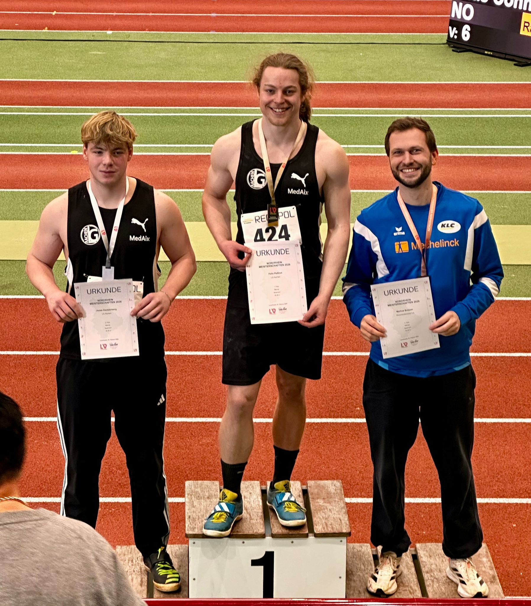 Nach mehreren Anläufen in den letzten Jahren schaffte es Felix Pellinat endlich auf den Meisterplatz im Speerwerfen. Erstmalig gelang es ihm aus dem Wintertraining heraus, die 50m-Marke zu übertreffen. Mit 50,46 m holze Felix Gold im Speerwurf der Männer. Knapp dahinter belegte Jonas Klinkenberg mit seinem ersten 50m-Wurf (50,29m) den Silberrang. Auch im Kugelstoßen stellte Felix mit 12,59 m eine neue Bestleistung auf. Lohn war die Bronzemedaille. Einen weiteren Podiumsplatz bei den Männern holte Linus Binder, der mit 22,70 sek Platz 3 über 200m belegte. Gold holte Matthias Holtermann nach Aachen. Matthias gewann das 5000m Bahngehen der Männer in 26:01,14 min.