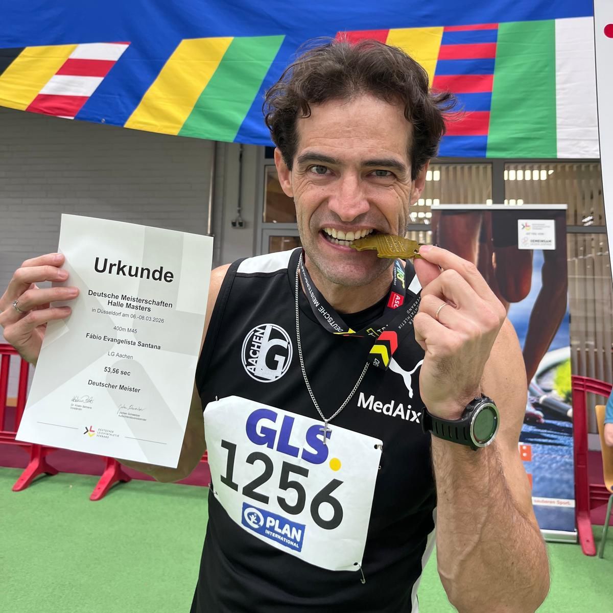 Das Training mit den „jungen Spunden“ hat sich gelohnt – Fabio Evangelista Santana, M45, gelang der Coup, sein Wochenende bei der Masters-DM in Düsseldorf zweifach zu vergolden. Samstags ging es auf die 400m-Langsprintstrecke. Innerhalb seiner Masters-Jahre ist diese Strecke für Fabio noch sehr jung – erst bei den Nordrhein-Master-Meisterschaften vor zwei Wochen wagte er sich auf die zwei Runden, die er dort noch eher vorsichtig anging. So kam es, dass er mit einer Bestzeit von 54,63 gemeldet, im zweiten von drei Zeit-Endläufen an den Start gehen musste. Fabio setzte sich von Anfang an unbeirrt an die Spitze, bewies ein gutes Tempogefühl in der ersten Runde, absolvierte die zweite Runde ohne großen Tempoverlust – und legte mit 53,56s eine dermaßen gute Zeit vor, dass der abschließende dritte Zeitendlauf mit den besten Läufern der Meldeliste nicht vorbei kam. Deutscher Meistertitel für unseren Brasilianer!