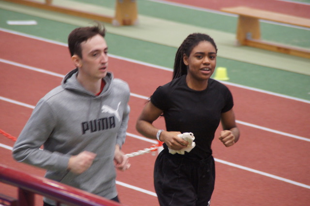 Der Sonntag gehört traditionell den Kurzsprintern. Aachens derzeit schnellste Sprinterin, Chelsea Port Le Roi (U20, Jg. 2003), erwischte im Vorlauf nach einem kurzen Zucken einen guten Start und steigerte ihre im Dezember aufgestellte Bestleistung um drei Hundertstel auf schnelle 7.83s – das war knapp die zweitschnellste Zeit im Feld und unterstrich erneut ihre Qualifikation für die Deutschen Hallenmeisterschaften im Februar. Leider gab es im Finale einen kleinen Zweiter-Schritt-Stolperer, der Chelsea auf den vierten Rang zurückwarf – die beiden Zweit- und Drittplatzierten Mädels liefen exakt Chelseas Vorlaufzeit – aber doch noch zu 7,87s reichte. Trotzdem eine tolle Leistung der jungen Sprinterin. Ebenfalls über 60m ging unser Neuzugang Niklas Görigk (Jg. 2002) ins Rennen. Es ist immer schwierig, sich im ersten Männerjahrgang zu behaupten und unsere Trainingsmöglichkeiten sind im Winter nicht eben schnellkraftfreundlich, aber Niklas rannte mit 7,29s eine neue Bestzeit. Es spricht für ihn, dass er damit nicht zufrieden ist und weiter an sich arbeiten möchte.