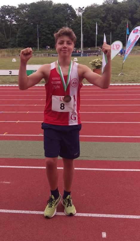 Jan Karl hatte es anschließend eilig zur Diskusanlage zu kommen, denn auch hierfür hatte er sich qualifiziert. Eine extrem steile Lernkurve seit März diesen Jahres ließ ihn im schnellen Ring technisch saubere Würfe anbieten. Drei Würfe landeten über seiner bisherigen Bestleistung, die er mit 27.49 m um zwei Meter verbesserte. In der Konkurrenz war diese Weite Platz 3 und eine schöne Bronzemedaille wert! Ein wahnsinns Einstand bei Landesmeisterschaften.
